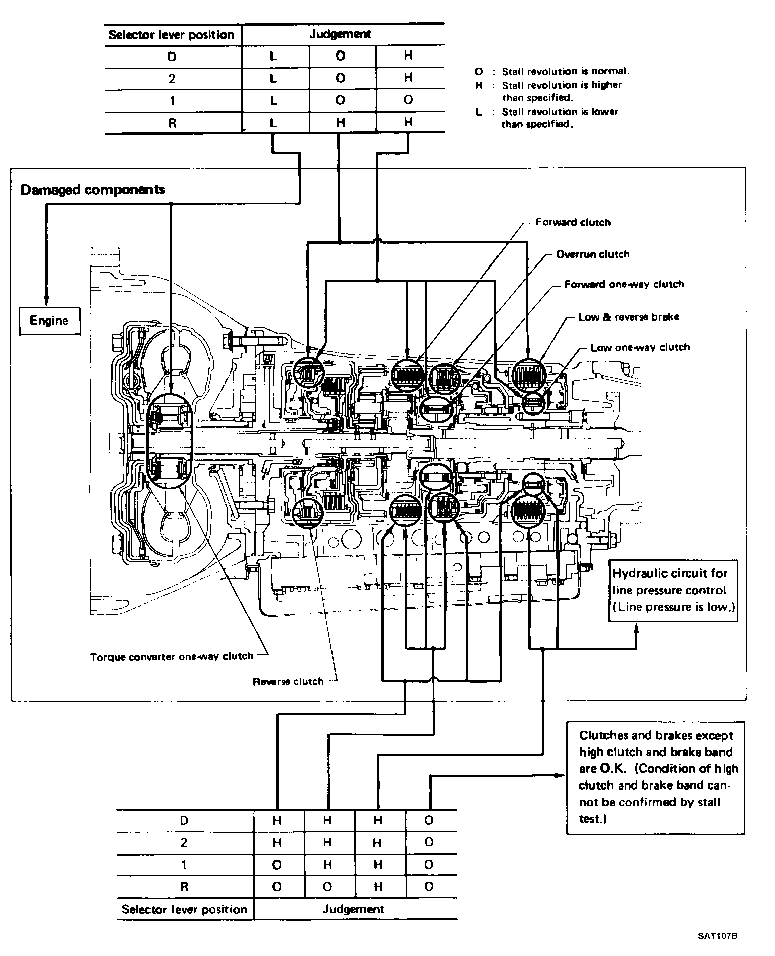 10. Perform stall tests in the same manner as in steps 5 through 9 with selector lever in "2", "1" and "R", respectively.