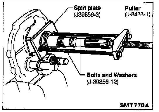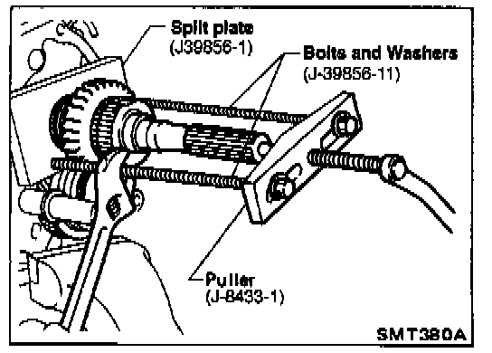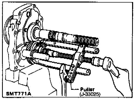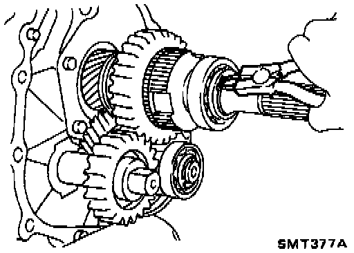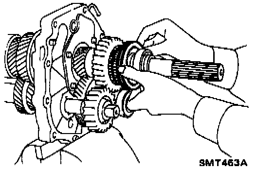 h. Pull out reverse main gear together with mainshaft spacer and reverse synchronizer hub. Then remove reverse gear needle bearings.