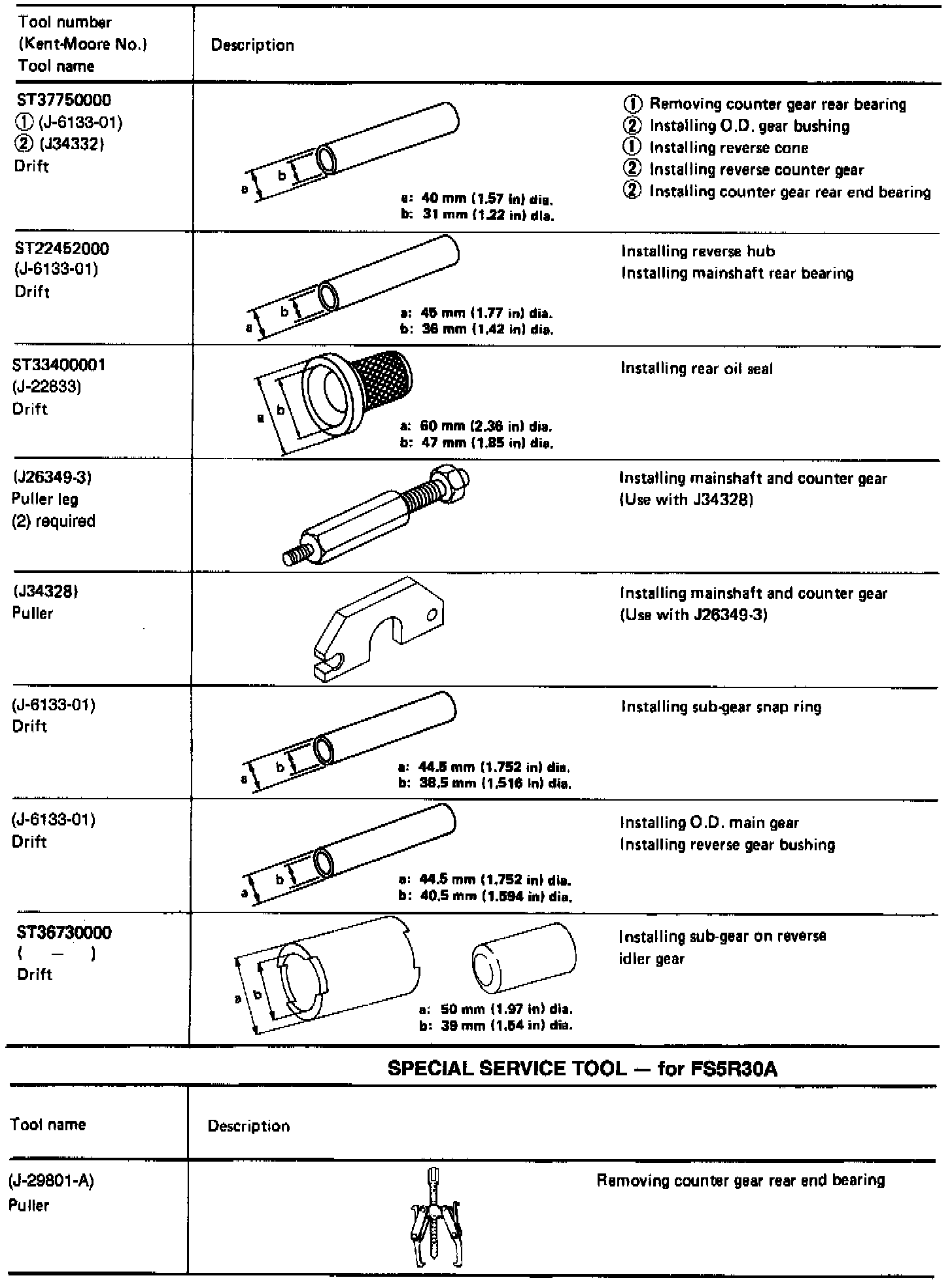 In addition to these tools, the service procedure for disassembling this transmission has also been modified. Please refer to the attached procedure whenever a repair is performed on the FS5R30A transmission.