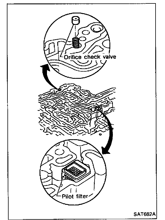 c. Place oil circuit of lower body face up. Install orifice check spring, orifice check valve and pilot filter.