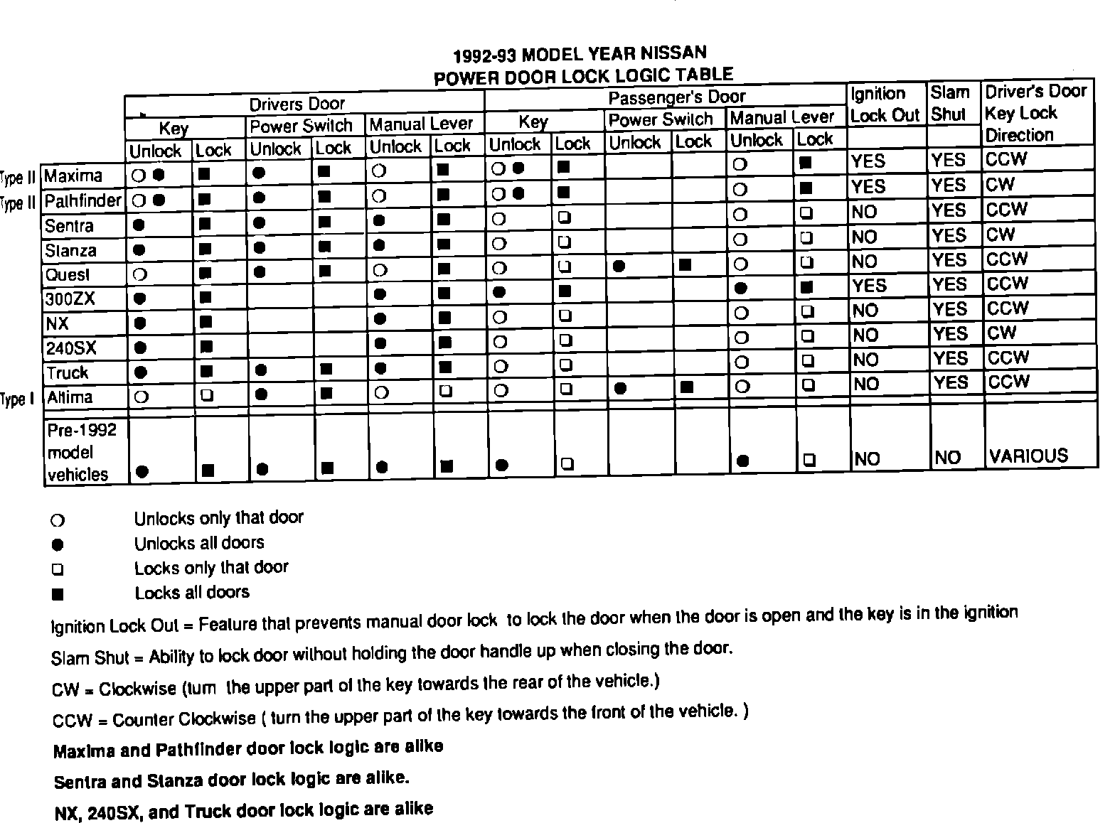 With the introduction of all new models in the future, Nissan door lock logic will be consolidated into two types: Type I and Type II. Type I door lock logic will be used in the 1993 Altima. Type II door lock logic will be used on vehicles such as the 1992 Maxima and Pathfinder.