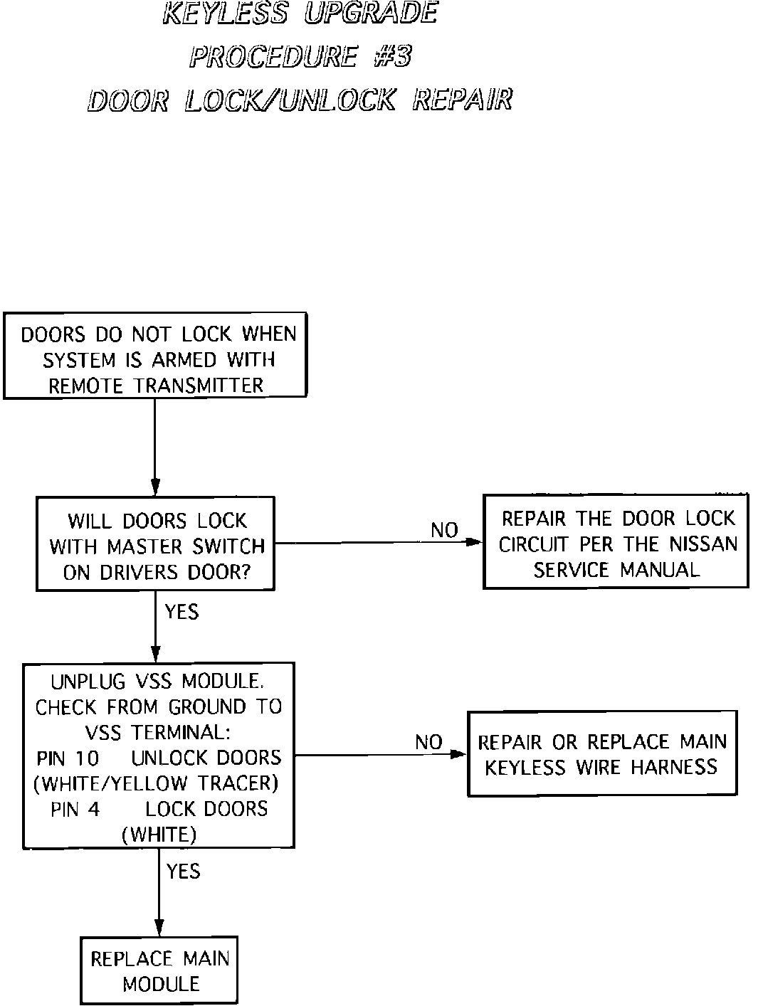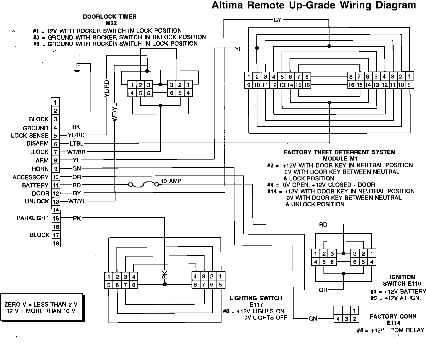 For troubleshooting the Altima Remote Keyless Entry system, a tester has been shipped to each Dealer (and can be ordered from Kent-Moore [J39857-A] ). This tester is designed to check the Remote Keyless Entry wiring harness and components. Complete each step in the following Testing Procedure to check for proper system operation. For your convenience, a wiring diagram is also provided.