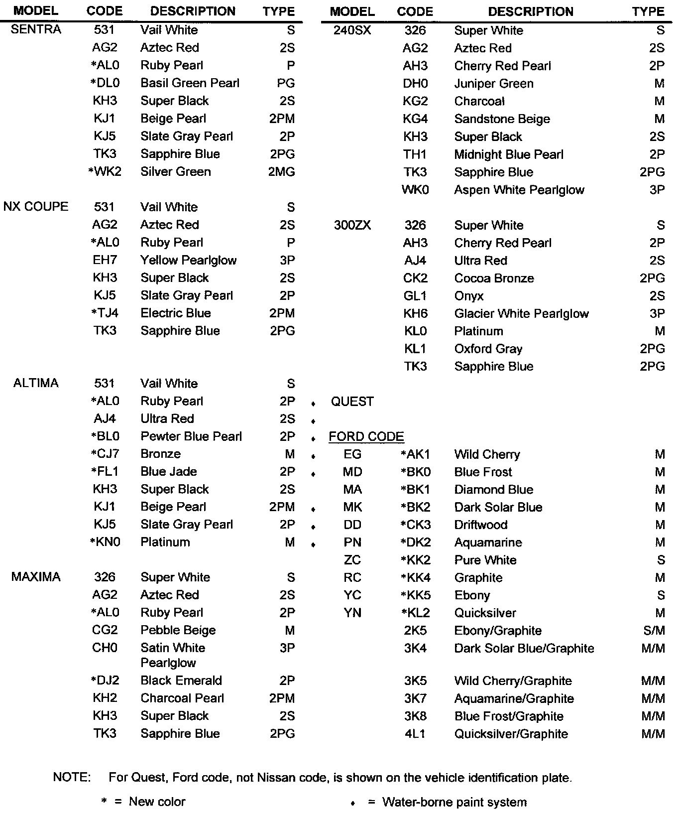1993 NISSAN PAINT COLOR CODES