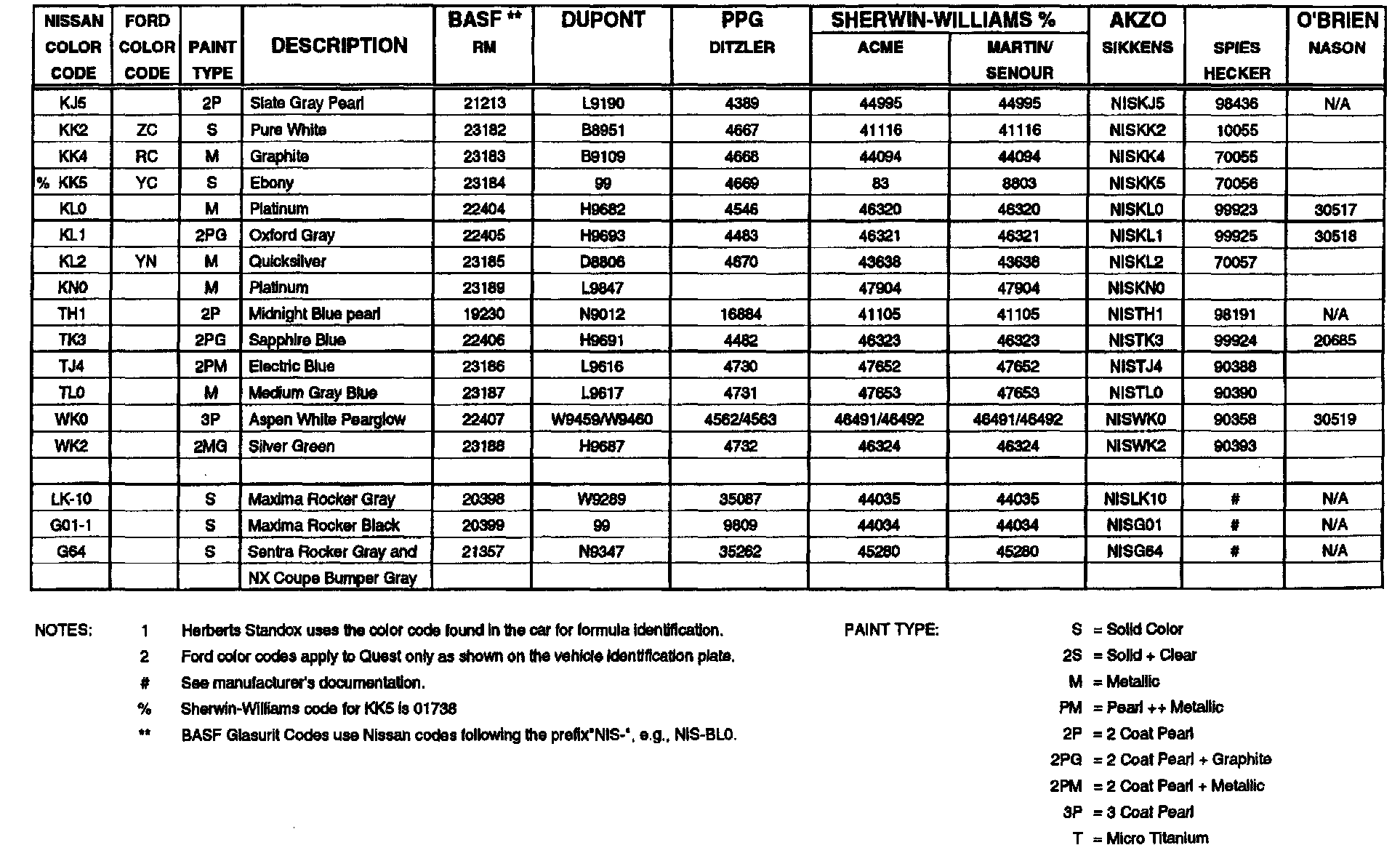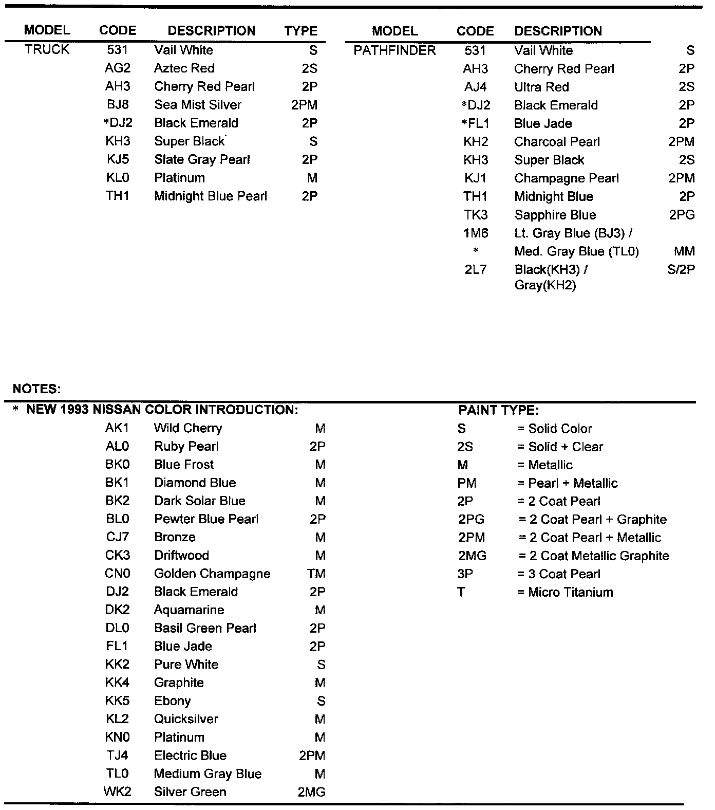 Included for your reference is a listing of all 1993 Nissan paint codes, color names, and refinish paint codes for major automotive paint manufacturers.