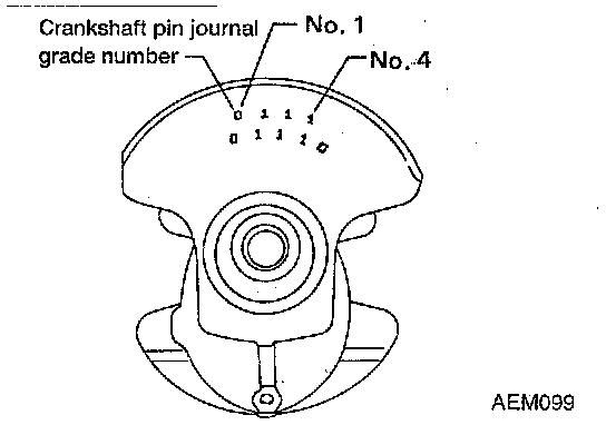 6. If it exceeds the limit, replace bearing. If clearance cannot be adjusted within the standard of any bearing, grind the crankshaft journal and use undersized bearing. Refer to Crankshaft Main Bearing for bearing clearance information. If the crankshaft is replaced with a new one, select connecting rod bearings according to the following table. The connecting rod bearing grade numbers are punched in either Arabic or Roman numerals.