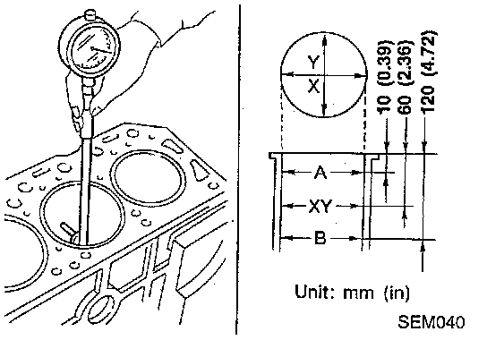 1. Using a bore gauge, measure cylinder bore for wear, out-of-round and taper. The standard inner diameter "Db" is 89.000 - 89.030 mm (3.5039 - 3.5051 inch). The wear limit is 0.2 mm (0.008 inch). Out-of-round (X - Y) is less than 0.015 mm (0.0006 inch). Taper is (A - B or A - C) less than 0.01 mm (0.0004 inch). If it exceeds the limit, rebore all cylinders. Replace cylinder block if necessary.