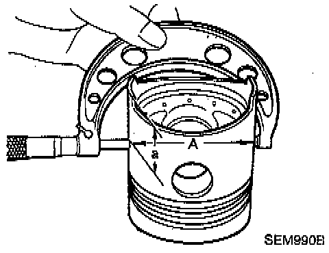3. Measure the piston skirt diameter and refer to Specifications. The measuring point "a" (distance from the top) is 52 mm (2.05 inch).