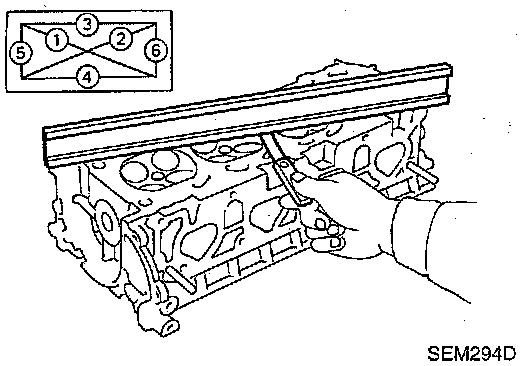 ^ Use a reliable straightedge and feeler gauge to check the flatness of cylinder head surface. Check along six positions shown in figure.