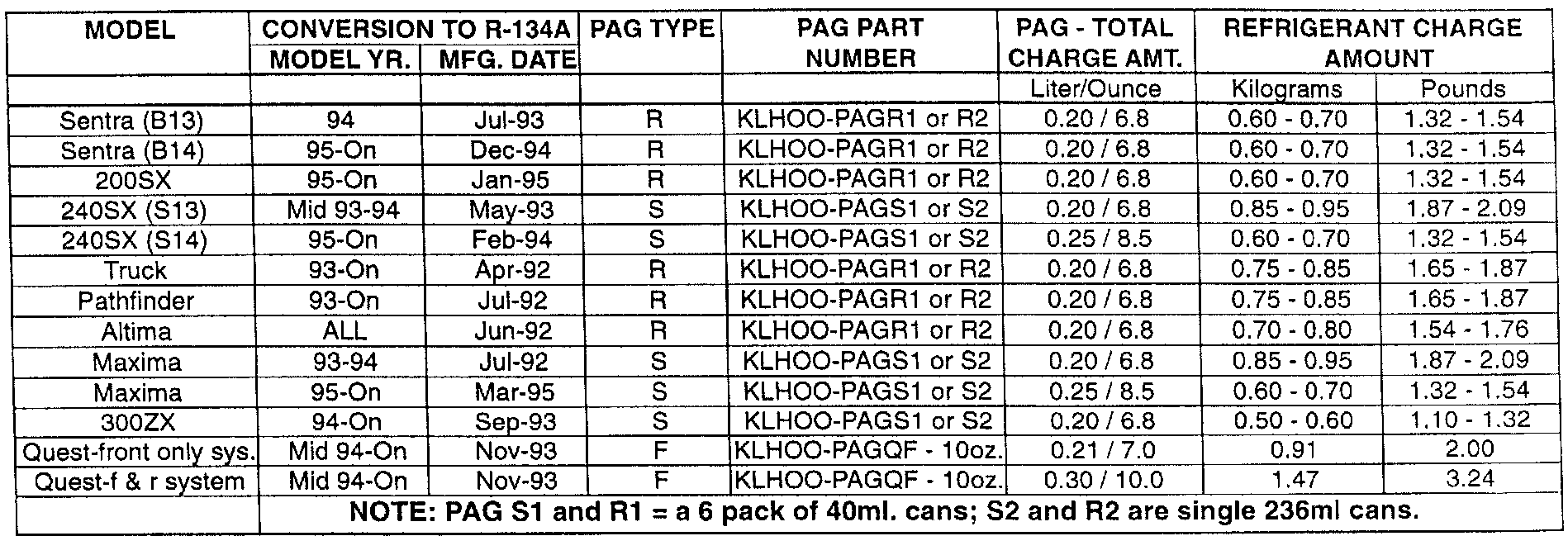 R134a CHARGE AMOUNTS/PAG LUBRICANT CHART