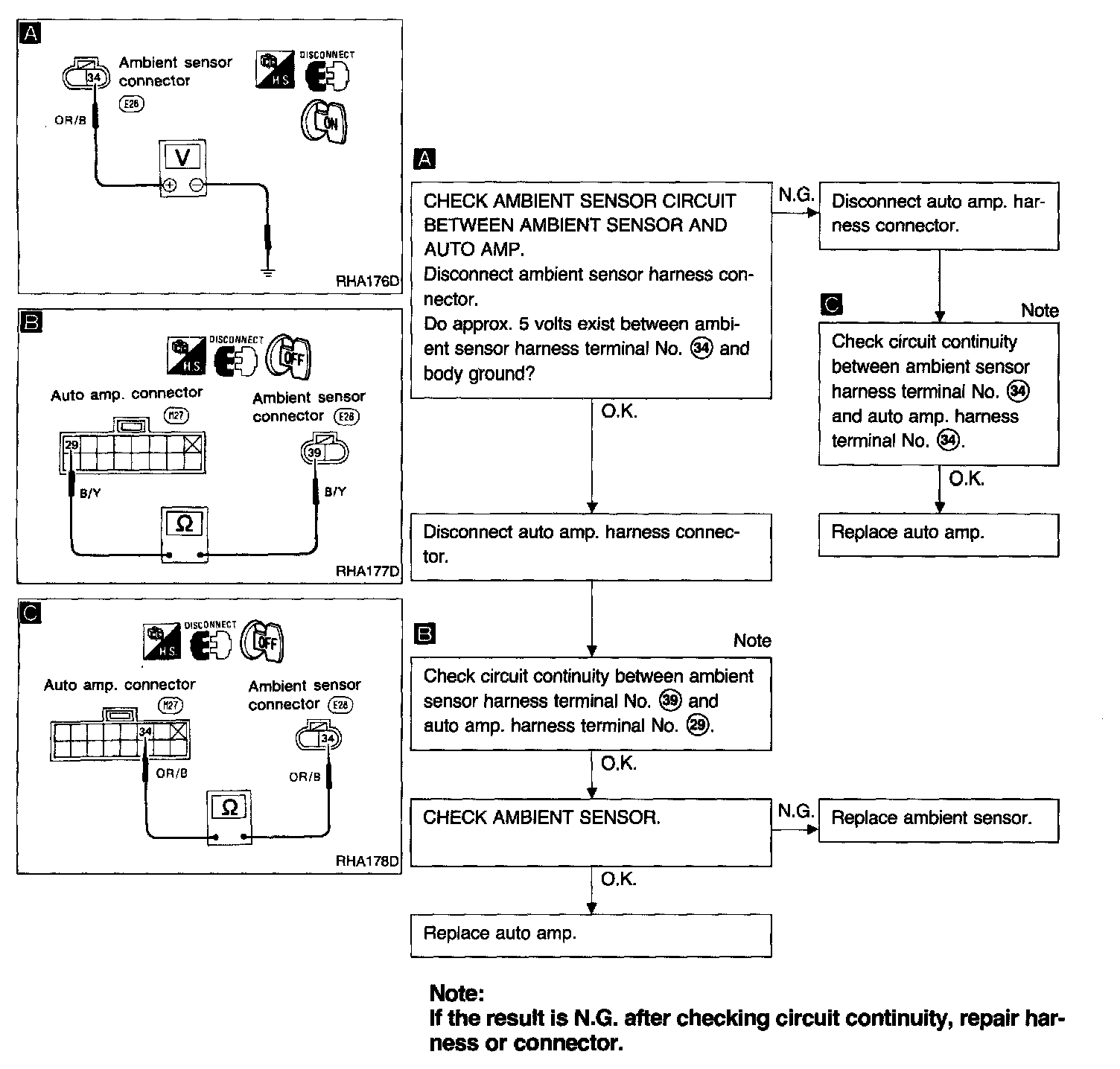 Ambient sensor circuit is open or shorted. (21 or ECON 21 is indicated on auto amp. as a result of conducting Self-diagnosis STEP 2.)