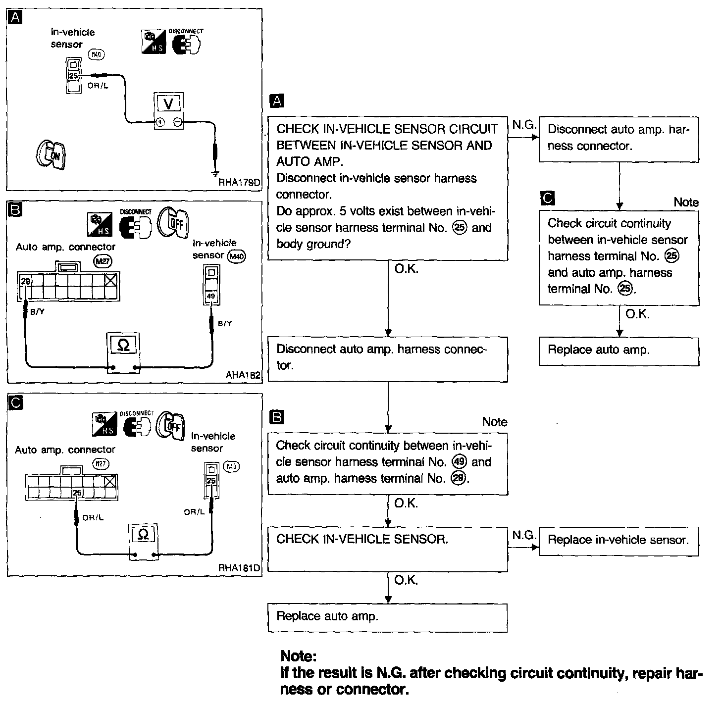 In-vehicle sensor circuit is open or shorted. (22 or ECON 22 is indicated on auto amp. as a result of conducting Self-diagnosis STEP 2.)