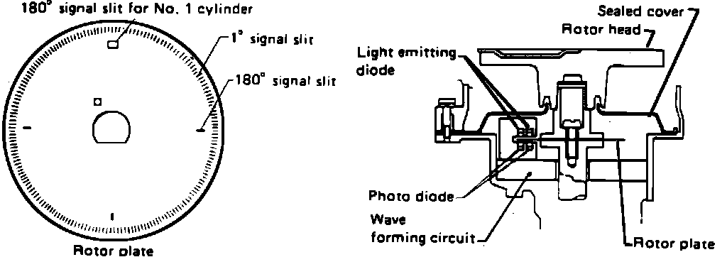 When the rotor passes between the photo diodes and Light Emitting Diodes (LED) the slits in the rotor plate cut the light being transmitted to the photo diode from the LED. This generates rough-shaped pulses which are changed into ON/OFF signals by the wave forming circuit. The Engine Control Module (ECM) interprets these signals to calculate engine rpm and cylinder position.