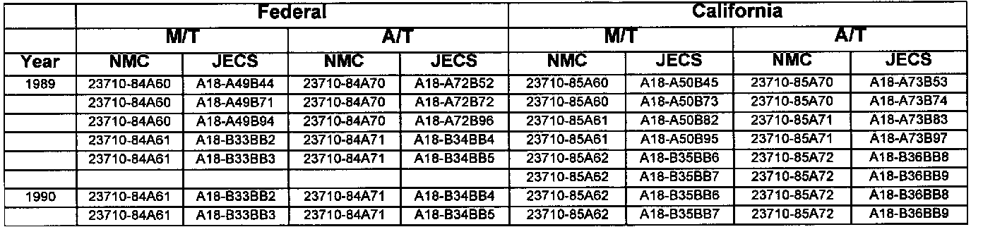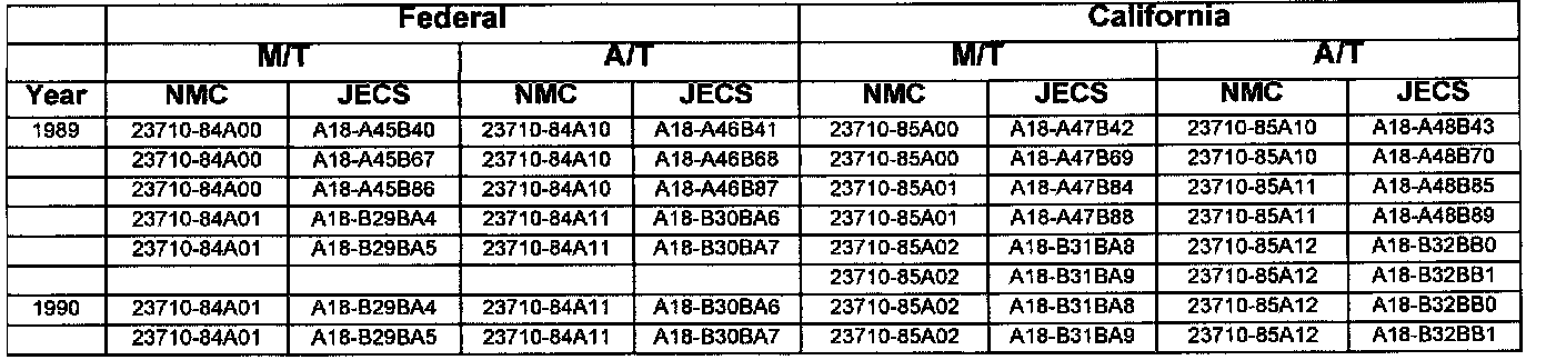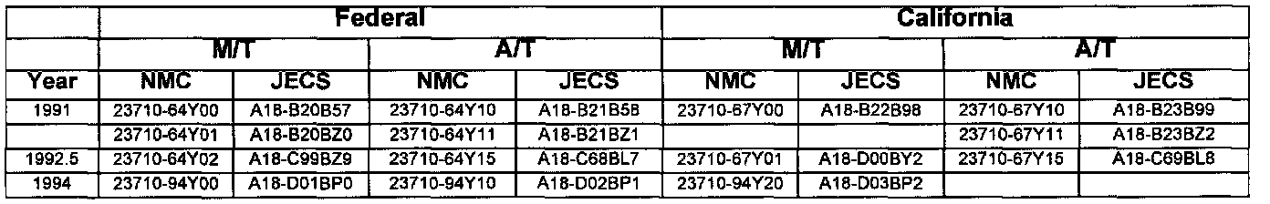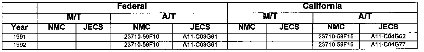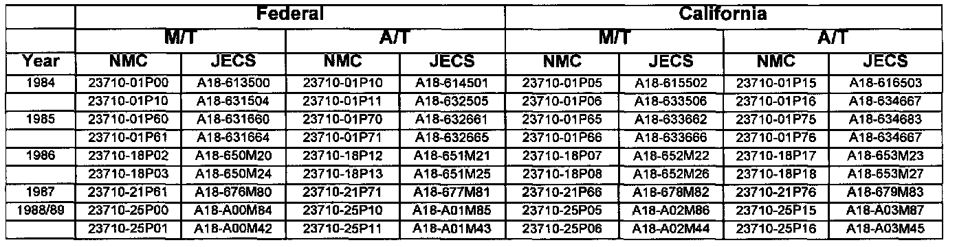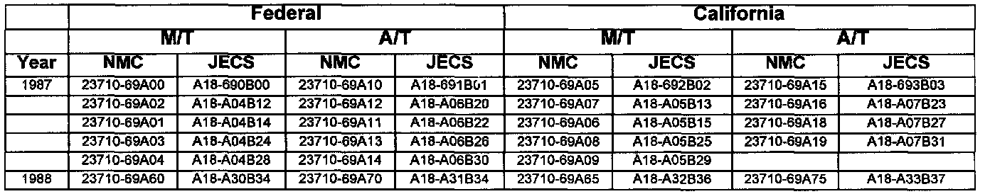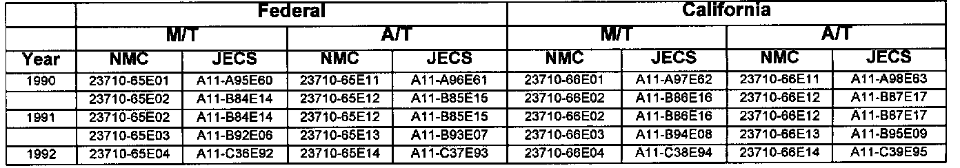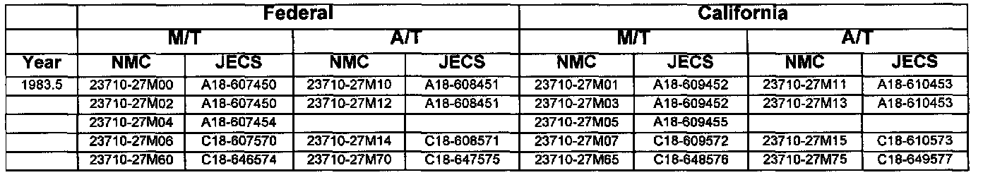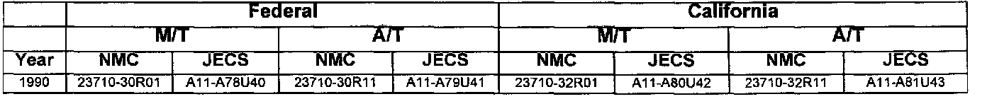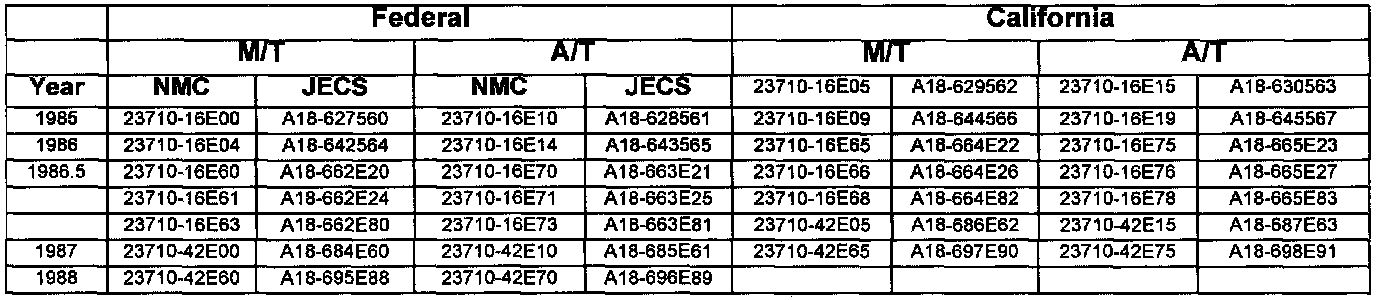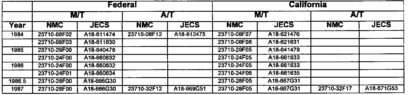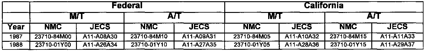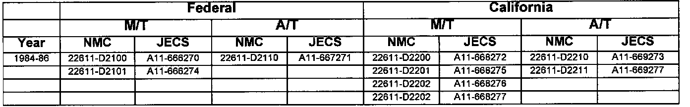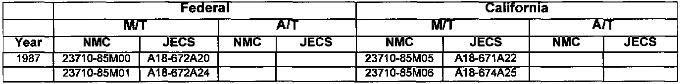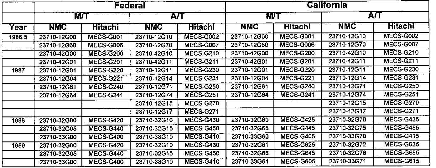 An ECM with a part number with 2371M-*****RE is a replacement ECM and should have the same programming as the original. If a vehicle has an ECM with a part number containing "M" and "RE", disregard the "M" and "RE" when using this chart.