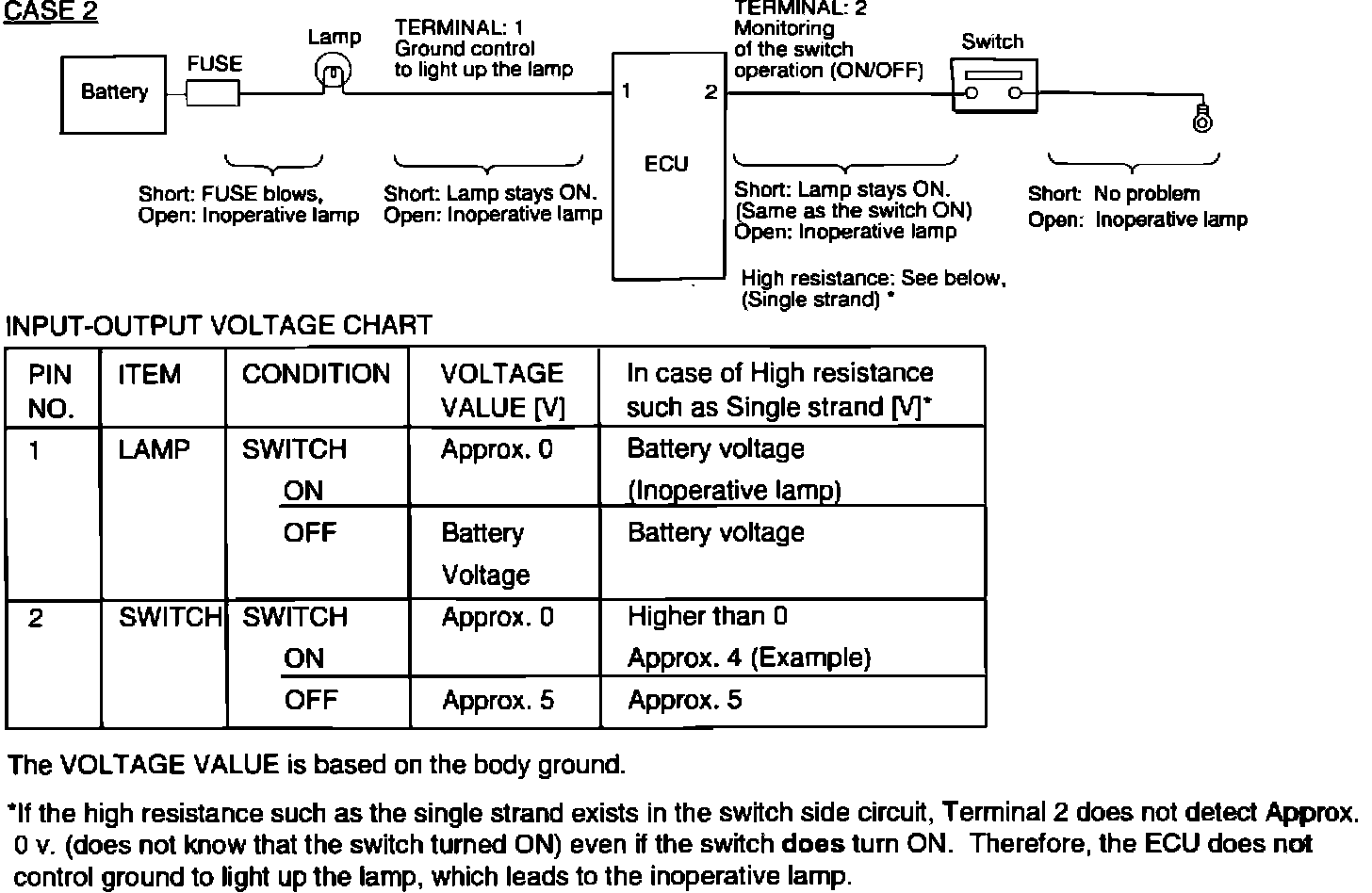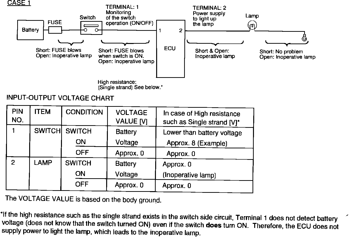 System description: When the switch is ON, the ECU lights up the lamp.