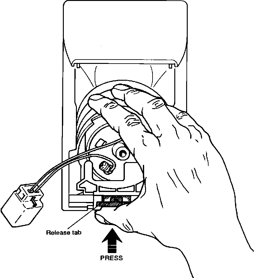 7. Remove fuel pump from fuel pump bracket by pinching the two (2) tabs together and lifting out of fuel tank bracket as shown.