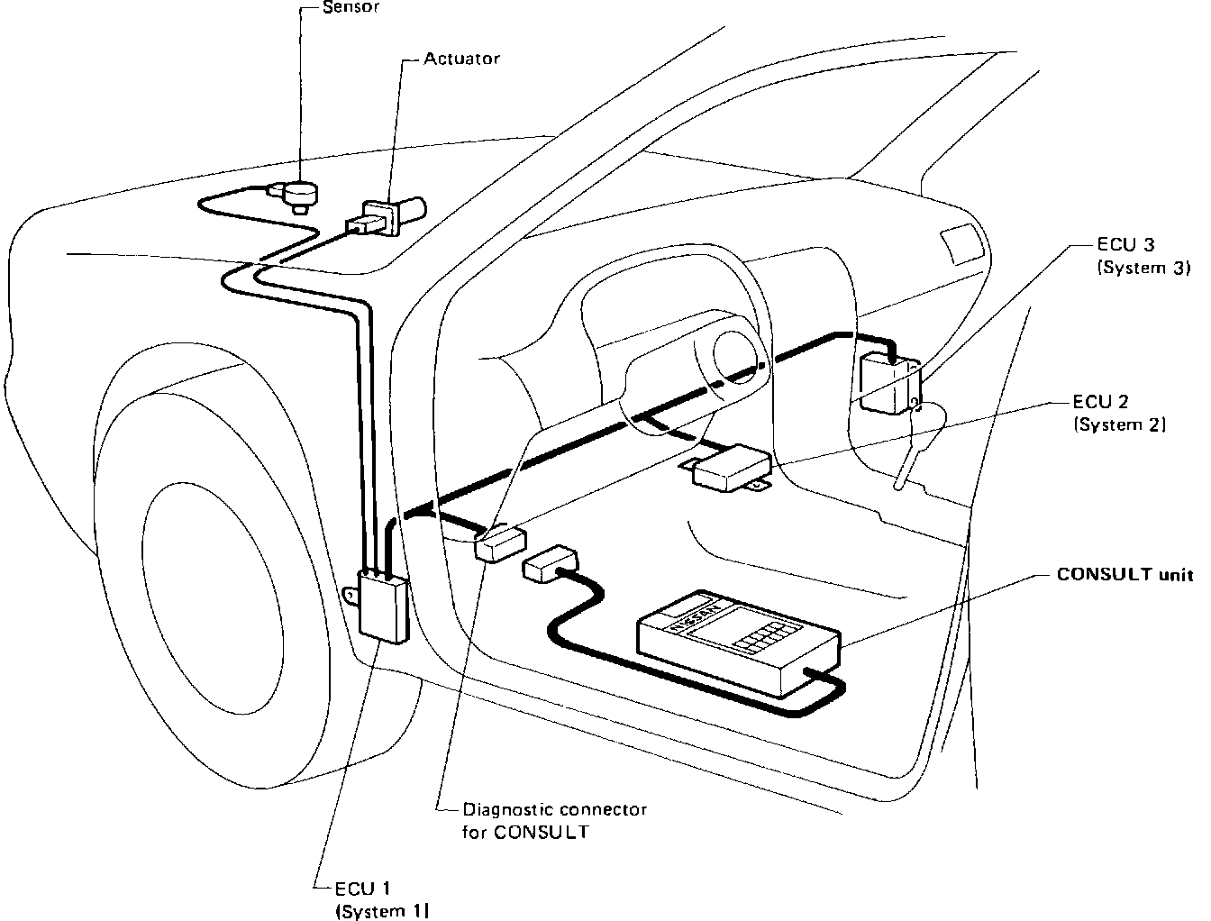 ^ Drive actuators by communicating with the electronic control unit through the diagnostic connector for the CONSULT. (Active test and Work support)