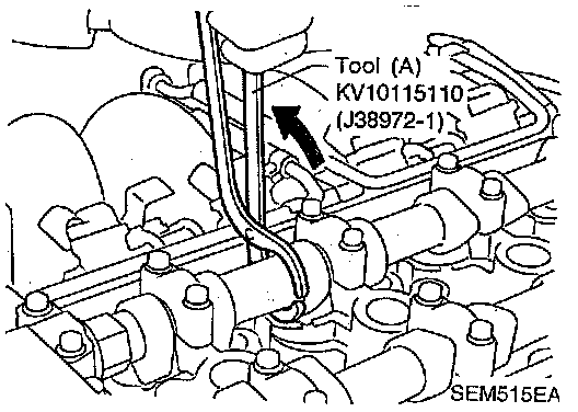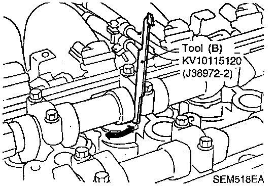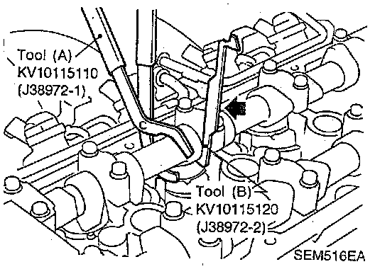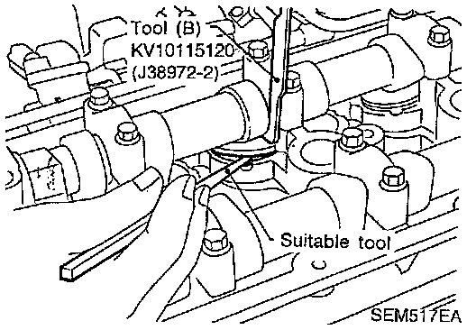 4. Place lifter stopper, tool No. J38972-2 (B), between camshaft and valve lifter to retain valve lifter.