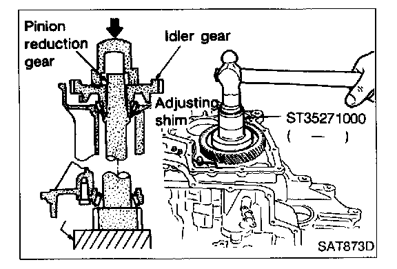 3. Install reduction gear and reduction gear bearing adjusting shim selected in step 2-e on transmission case.