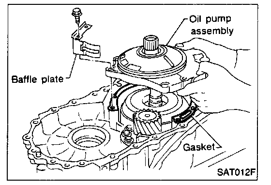 5. Install oil pump assembly, baffle plate and gasket on transmission case.