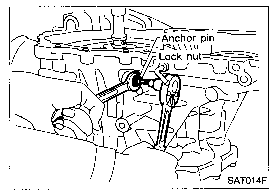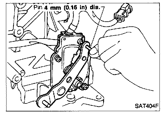 d. Insert 4.0 mm (0.157 in) dia. pin into adjustment hole in both inhibitor switch and manual shaft as near vertically as possible.