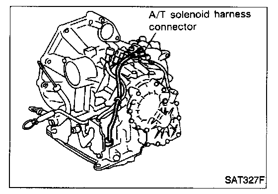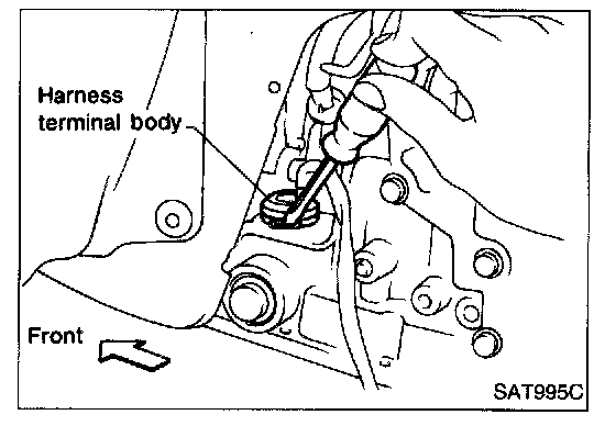 5. Remove A/T solenoid harness from transmission case by pushing on terminal body.