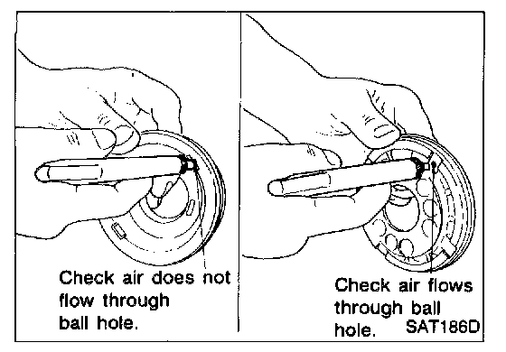 - Apply compressed air to oil hole on return spring side to make sure that air leaks past ball.