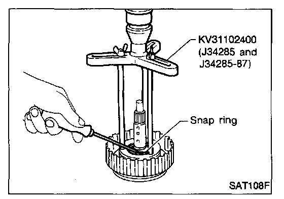 5. Set Tool on spring retainer and remove snap ring from high clutch drum while compressing return springs.