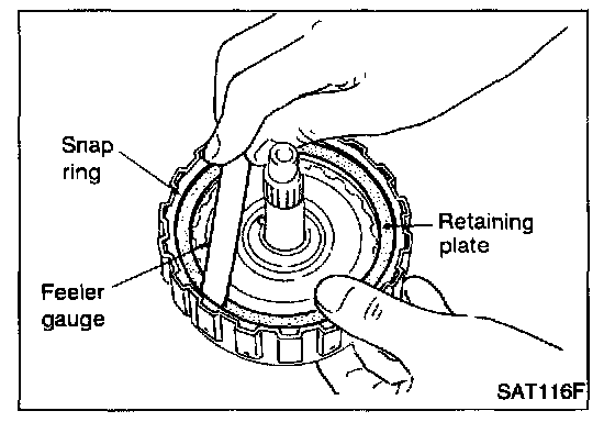 7. Measure clearance between retaining plate and snap ring. If not within allowable limit, select proper retaining plate.
