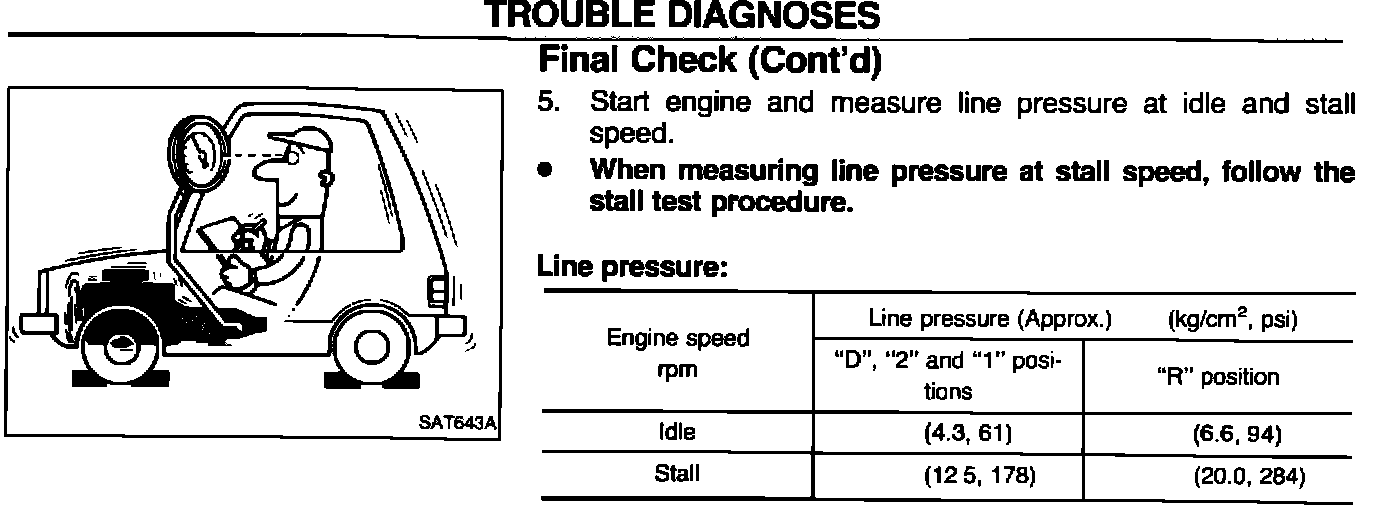 Included in this Bulletin is an amended page AT-84 for the 1993 Altima Service Manual showing the correct line pressure at idle speed as shown.