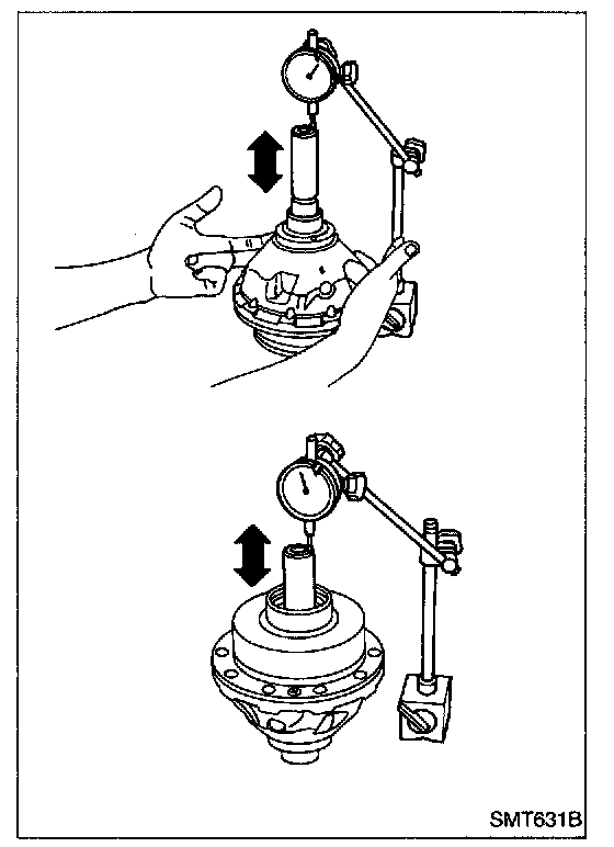b. Move side gear up and down to measure dial indicator deflection. Always measure indicator deflection on both side gears.
