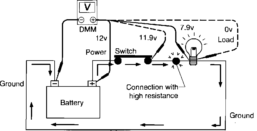 2. An unusually large voltage drop will indicate a component or wire that needs to be repaired. As you can see in the illustration above, the poor connection causes a 4 volt drop.