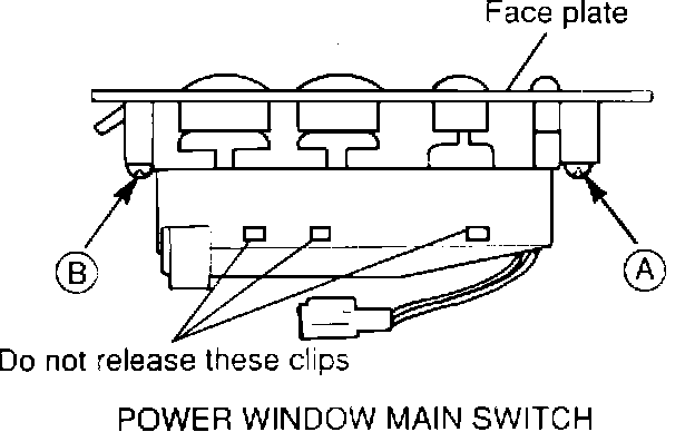 2. When removing the face plate from the power window main switch, remove only the screws at points A and B shown. Do not release clips for the bottom cover of the main switch since this will damage the switches.