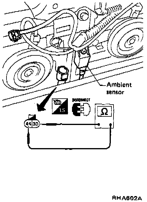 After disconnecting ambient sensor harness connector, measure resistance between terminals 30 and 44 at sensor harness side, using the table below.