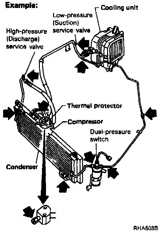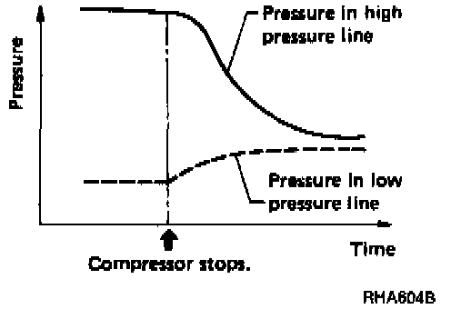 Refrigerant leaks should be checked immediately after stopping engine, beginning with high pressure line, using a gas leak detector. This is because the pressure in high pressure line drops gradually after refrigerant circulation stops while the pressure in low pressure line rises gradually as shown in the graph at left. Leaks can be detected easily when pressure is high.
