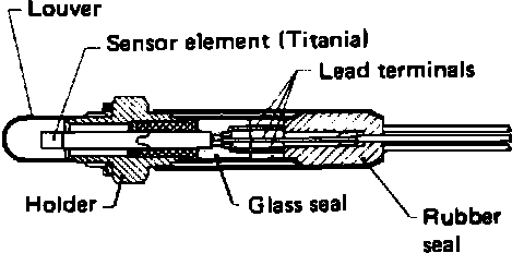 The sensor has a closed tube made of ceramic titania. The inner surface of the tube is is exposed to atmosphere while the outer surface is exposed to the exhaust gas.
