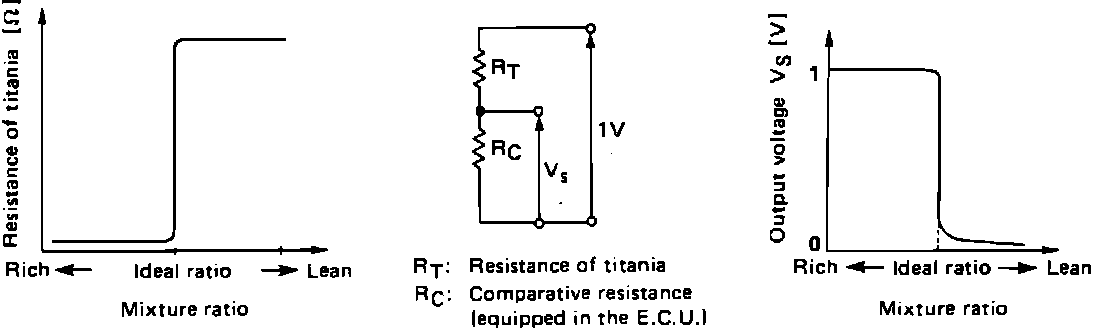 The titania in the sensor changes it's electrical resistance drastically at the moment the "ideal" air-fuel ratio is achieved. When the ECM reads a change from the source voltage, the fuel injector pulse width will be modified accordingly.
