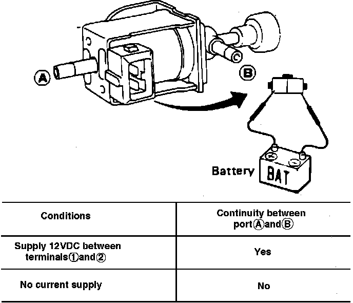 Apply voltage to the solenoid terminals as shown above and check air passages for continuity.