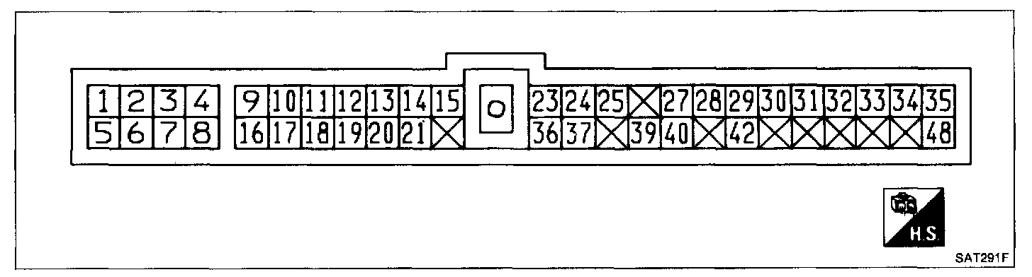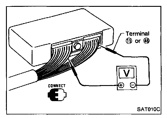 INSPECTION OF A/T CONTROL UNIT- Measure voltage between each terminal and terminal (15) or (44) by following "A/T CONTROL UNIT INSPECTION TABLE".