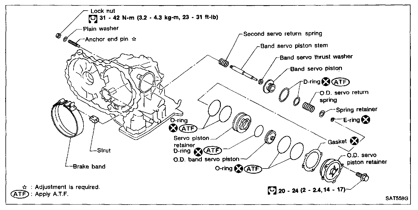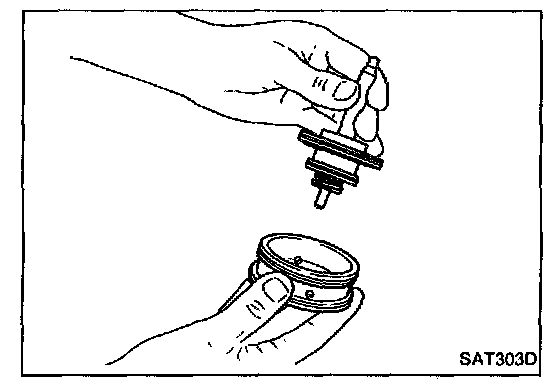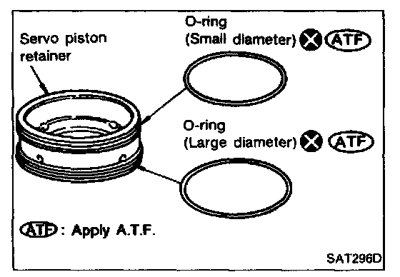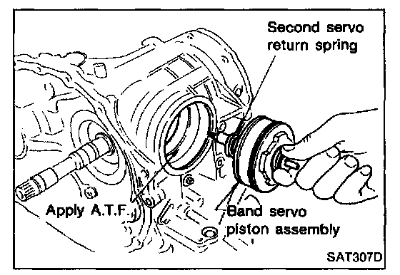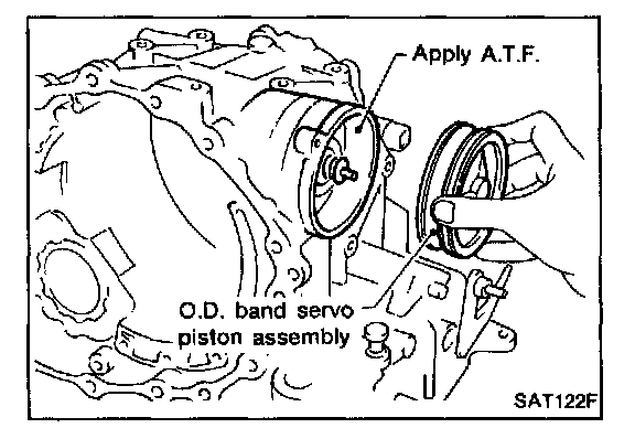 - Apply A.T.F. to O-ring of band servo piston and transmission case.