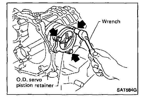 2. Apply compressed air to oil hole in transmission case to remove O.D. servo piston retainer and band servo piston assembly.