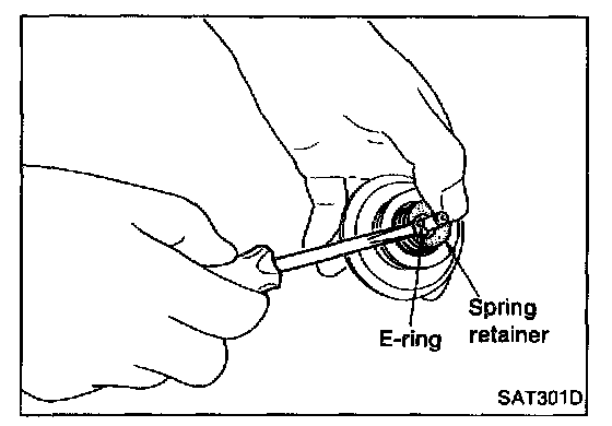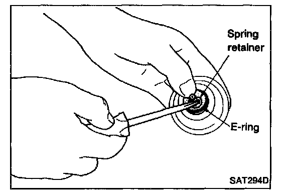7. Place piston stem end on a wooden block. While pushing servo piston spring retainer down, remove E-ring.