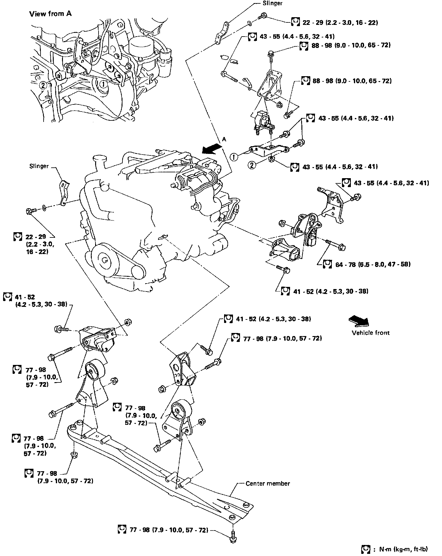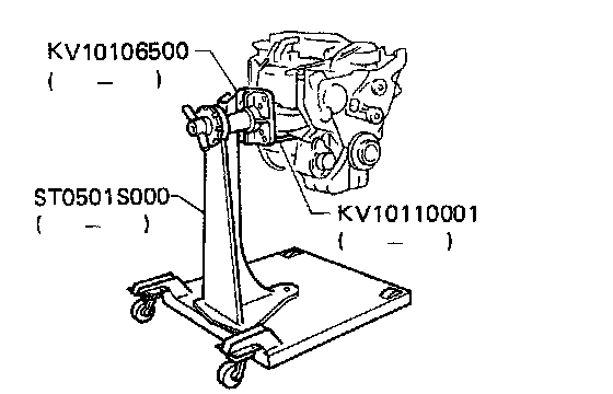 ^ When lifting engine, be careful not to strike adjacent parts, especially accelerator wire casing, brake lines, and brake master cylinder.