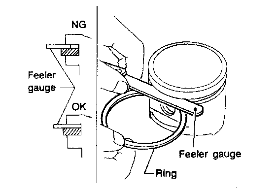 If out of specification, replace piston ring. If gap still exceeds the limit even with a new ring, rebore cylinder and use oversized piston and piston rings. When replacing the piston, check the cylinder block surface for scratches or seizure. If scratches or seizure is found, hone or replace the cylinder block.