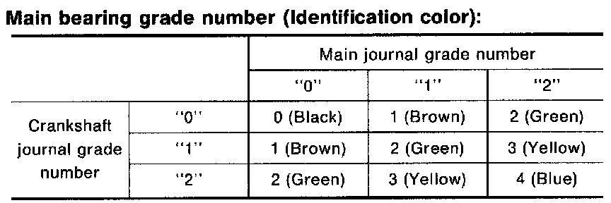 8. If crankshaft is reused, measure main bearing clearances and select thickness of main bearings. If crankshaft is replaced with a new one, it is necessary to select thickness of main bearings as follows:
