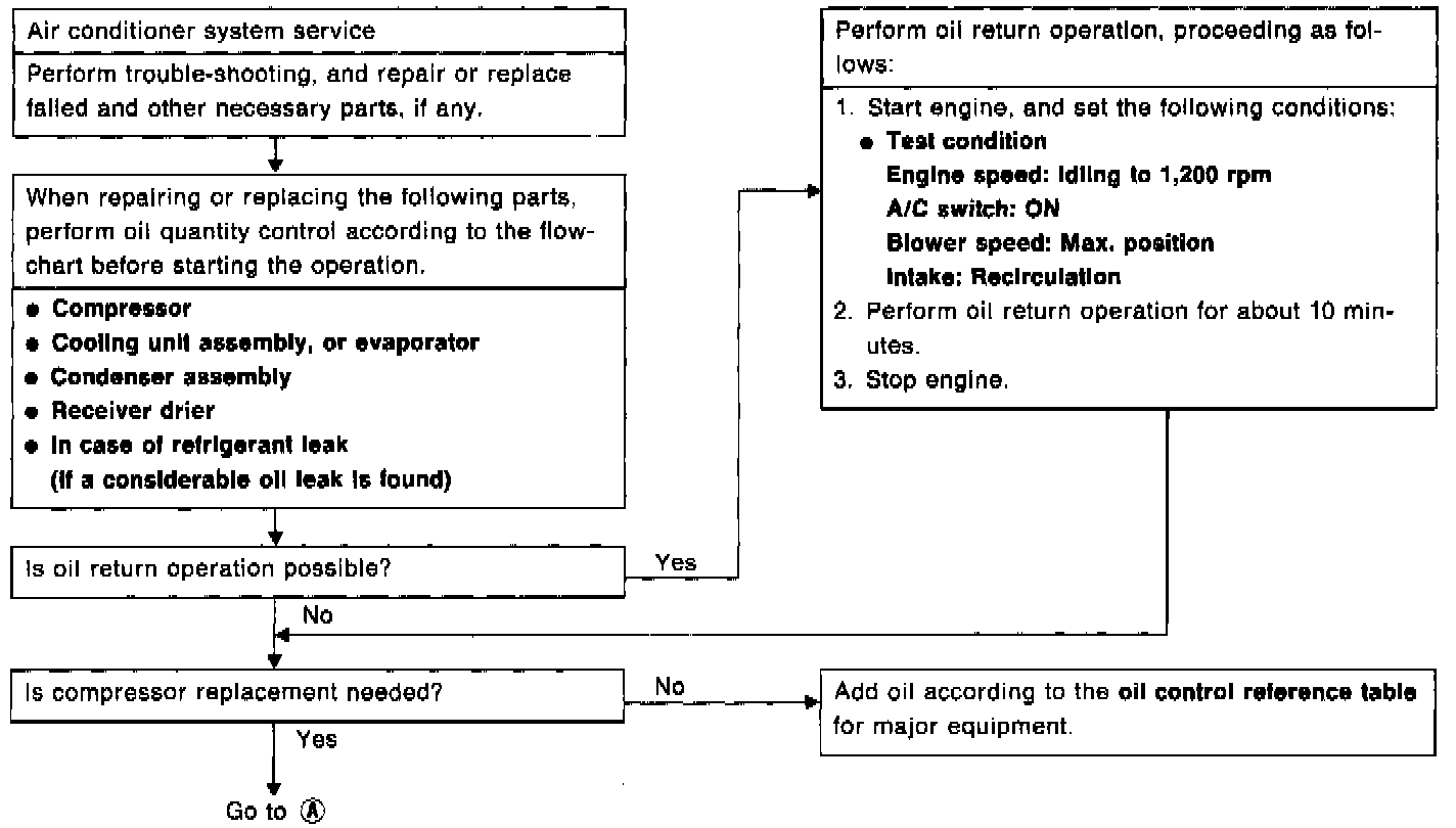 The refrigerant has a large affinity for the compressor oil, and a part of the oil is always circulating throughout the cycle together with the refrigerant. In other words, the oil is distributed throughout the cycle. Before draining the refrigerant, it is therefore necessary to collect as much compressor oil as possible by performing the oil return operation. If the compressor oil is not replenished, or added fully after replacing component parts of refrigerant cycle, the following trouble may occur:
