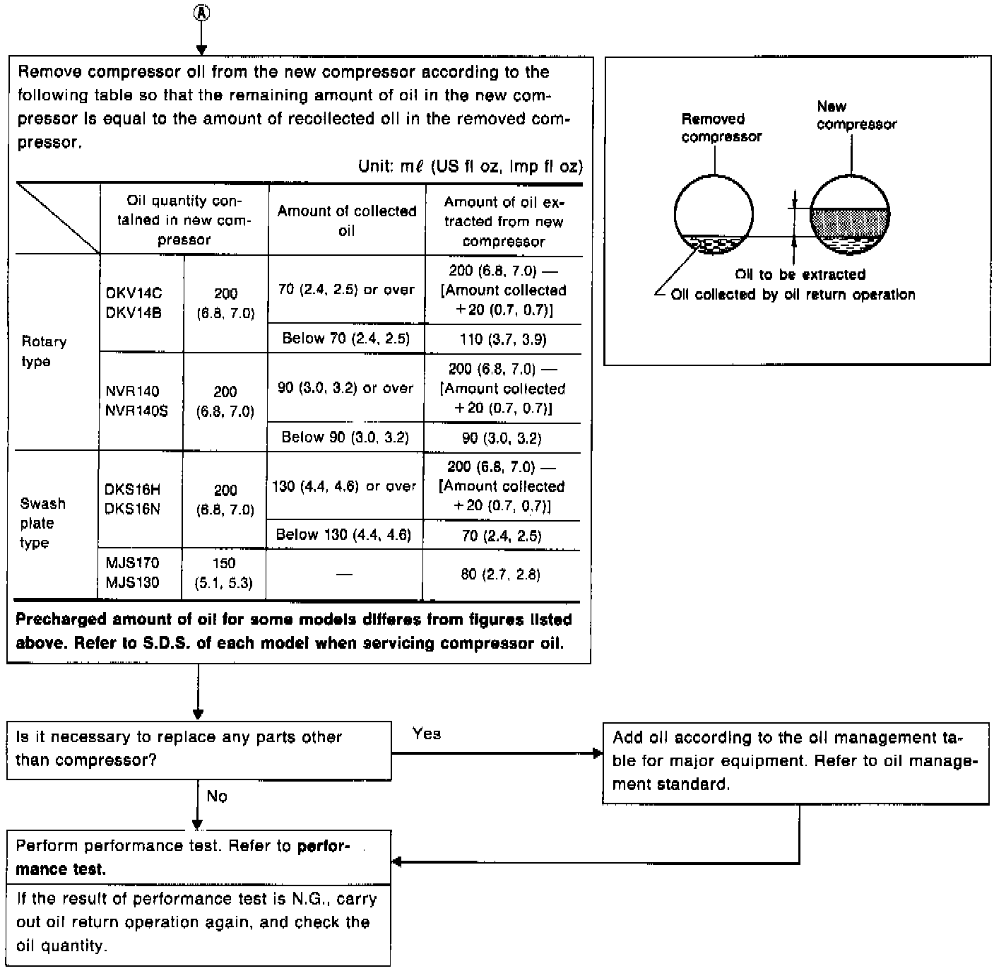 For this reason, whenever replacing any parts of the refrigerant cycle (except the compressor), it is necessary to replenish the compressor oil removed together with such parts. On the other hand, a new compressor contains a specified amount of compressor oil, and simple installation of the new compressor results in excessive oil quantity in the cycle. To prevent this, the oil must be extracted from the cycle so that the optimum oil quantity can be ensured inside the refrigerant cycle.