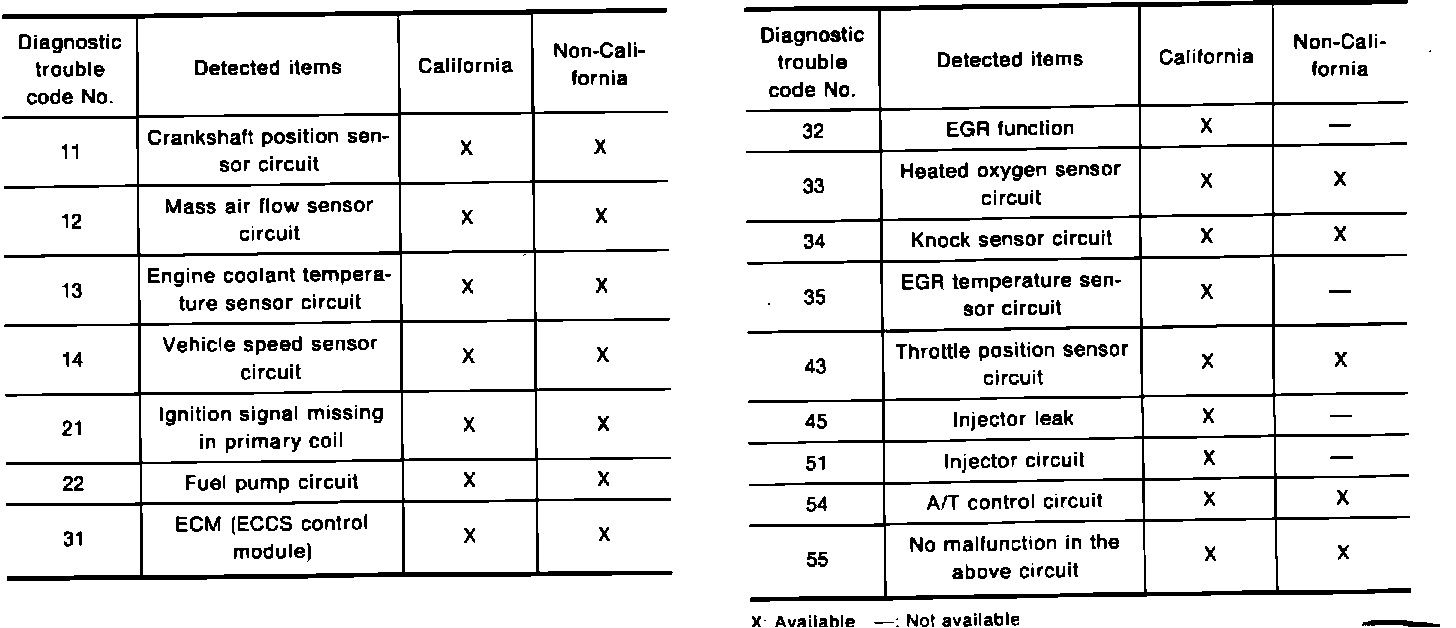 Self-diagnosis Codes Availability Chart:
