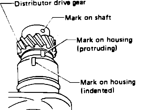 2. Align the dot on the distributor shaft with the lower protruding line at the bottom of the distributor housing (not the indented mark).