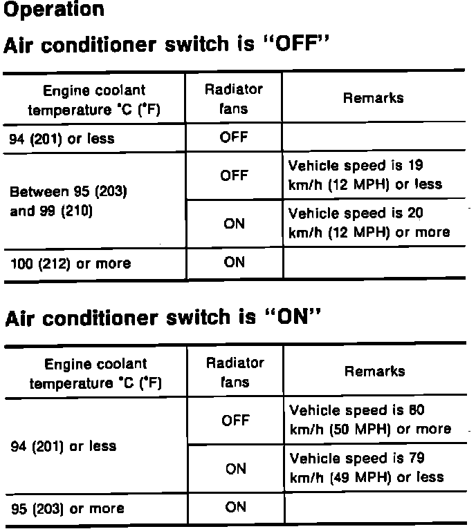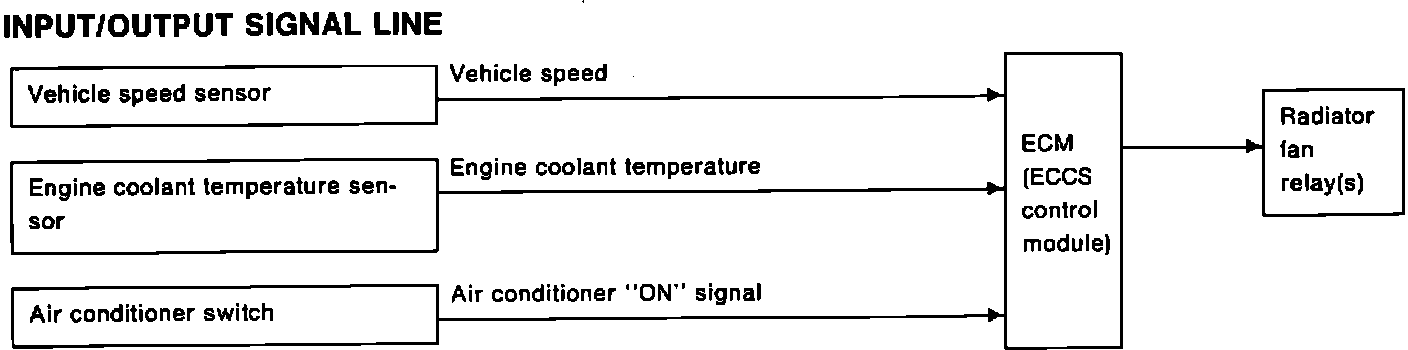 The ECM provides the ground signals to the radiator fan relays to control fan speed and operation based on signals supplied from the engine temperature sensor, A/C switch and vehicle speed sensor.