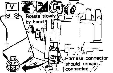 4. Using a volt meter, check voltage between terminal D and ground while rotating it slowly. Compare readings to those in the image.